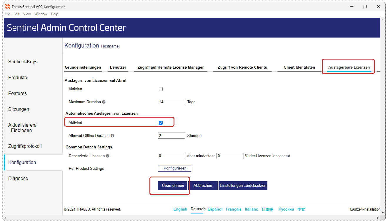 5. Eine andere Einstellung finden Sie im Bereich Auslagerbare Lizenzen/Detachable Licenses. Hier bitte zwei Werte setzen, Maximale Dauer/Maximum Duration auf 14 Tage und Automatisches Auslagern von Lizenzen/Automatic Detaching of Licenses Aktiviert/Enable.