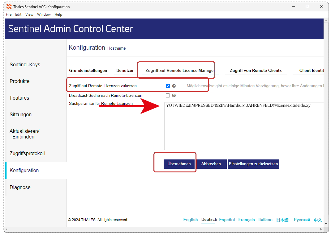 4. In der Kategorie Konfiguration/Configuration gehen Sie in den Bereich "Zugriff auf Remote License Manager/Accesss to Remote License Manager. Aktivieren Sie hier den Zugriff auf Remote-Lizenzen und fügen unter Suchparameter für Remote-Lizenzen/Remote License Search Paramter den zugesendeten Schlüssel ein. Submit/Übernehmen nicht vergessen.